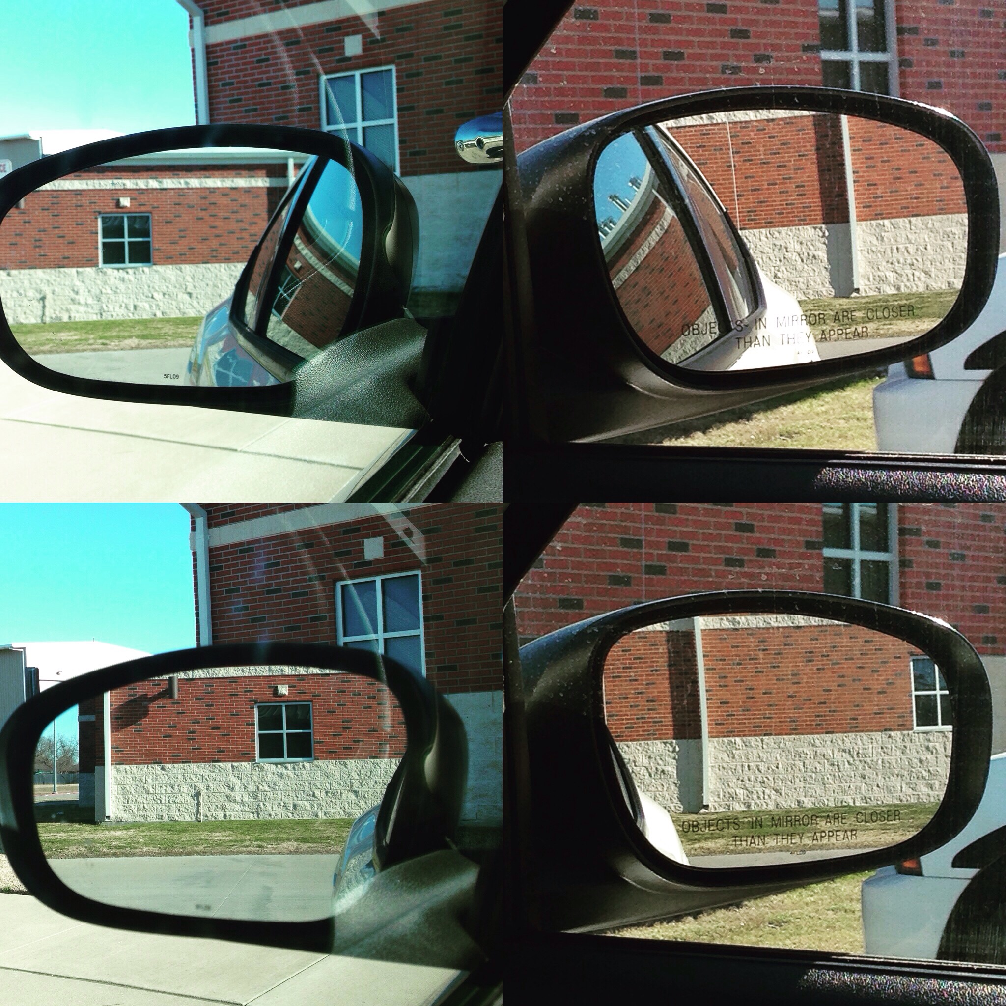 So I have this teeny-tiny idiosyncrasy. I drive with my side view mirrors adjusted to show as much of the world around me as possible (See the two bottom pics).